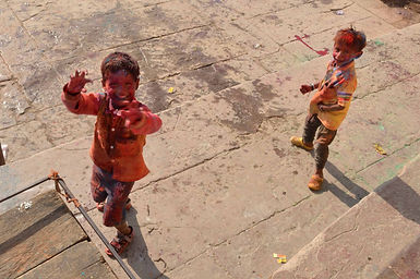 Lundi, c’est le début de la bataille des couleurs, en poudre ou mélangé dans de l’eau, celles-ci fusent de partout au petit matin. Tout le monde se badigeonnent de couleurs mutuellement puis s’enlacent en se souhaitant un « Happy Holi ». Mais on ne tarde pas trop dans les rues, en effet dans la foule, constituée principalement d’hommes, certains comment à être « éméché »et nous ne souhaitons pas rencontrer de désagréments. La fête continue sur certains toits des maisons et des hôtels avec de la musique. Vers midi, les indiens vont se laver de toutes leurs couleurs dans le Gange et la fête se calme petit à petit avec au soir, d'autres célébrations.