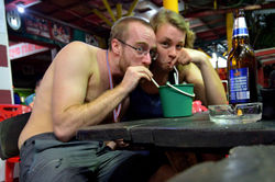 16/01: Nous sommes sur le départ vers Phuket. On a passé un superbe séjour à Koh Phi Phi, l'ile est vraiment magnifique, tellement qu'elle est envahie de touristes. Nous avons déambulé dans les rues piétonnes du centre, nous sommes parti au petit matin à Maya Bay, là où à été tourné le film "la plage"; fait le tour de l'ile en bateau pour se baigner et admirer les poissons dans une eau bien chaude (on est loin des températures de la Manche...); hélas, plus un seul bout de corail n'est en vie, résultat du tourisme de masse pour une ile si petite... Hier soir, nous avons passé notre soirée au "reggae bar", encore un me direz-vous? Oui, mais celui-ci est particulier, il a un ring de boxe au milieu pour accueillir des combats entre pro de la boxe thaï ou entre touristes, ces derniers reçoivent en retour une "bucket" (sceau d'alcool avec soft, un rhum (local) avec du coca dans notre cas). Après quelques combats, je (Gérald) me lance et part boxer pour la première fois de ma vie contre un argentin aussi inexpérimenté (heureusement) que moi. Rien de très beau dans ce match mais c'était fun et on finit ex-æquo et avec une bucket chacun pour finir la soirée.