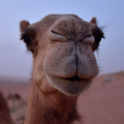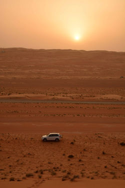- jour 2: Départ des montagnes, la piste est encore plus ardue que la veille pour sortir du djebel akhdar. On arrive à Nizwa en fin de matinée, on visite le fort et le souk, tous deux restaurés parfaitement. L'endroit est magnifique au milieu de ces bâtiments blancs et neufs entourés de palmiers. Après manger, on prend la direction de la ville de Badiyah, point d'entrée du désert de Wahiba. Première conduite sur sable, la voiture glisse vite sur les côtés mais avance toujours aussi facilement. Par contre, pas de tente ce soir, il y a trop de vent et les piquets ne tiennent pas assez bien dans le sable, on se contentera des sièges de la voiture. Au moment du repas, on est rejoint par un troupeau de dromadaire qui s'installent derrière notre 4x4, c'est très sympa et marrant, les plus grands se laissent facilement approcher pour se faire caresser ou gratter. Mais au début de la nuit, il faut chasser le troupeau, les plus petits viennent se gratter contre la voiture...