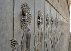 Lundi matin, nous partons pour Persepolis. Nous nous y rendons en taxi, en peugeot 405 plus précisément, modèle toujours fabriqué actuellement en Iran. Après 3/4 d'heure de route, nous voici dans l'ancienne capitale perse construite vers -500 av.J.C. et détruite presque entièrement 200 ans plus tard par Alexandre le grand. Il ne reste que très peu de choses intactes de la ville hormis des colonnes, des statues et surtout un long bas-relief parfaitement conservé montrant les différentes ethnies du royaume (éthiopiens, afghans, grecs, syriens, arméniens...) ammenant les cadeaux au "roi des rois". A côté de la cité, se trouve Nécropolis où les tombes de 4 grands rois perses qui seraient Darius Ier, Xerces Ier, Artaxerces Ier et Darius II. Ces 4 tombes sont gigantesques et sculptés en forme de croix en plein cœur de la montagne. Notre dernière étape de la journée est Pasargad, l'ancienne capitale avant Persepolis où le seul bâtiment encore debout est le mausolée d'un autre roi perse.